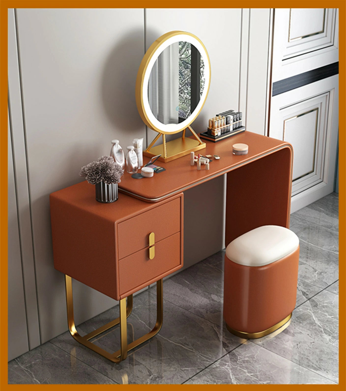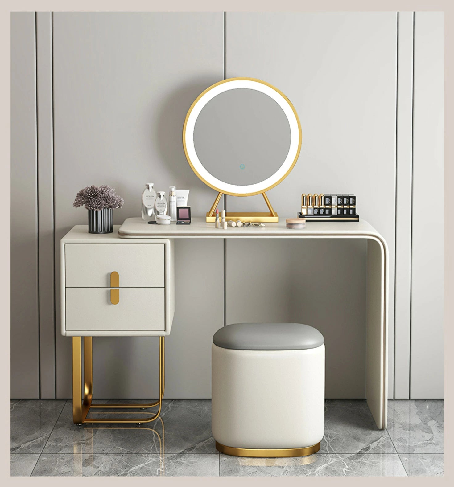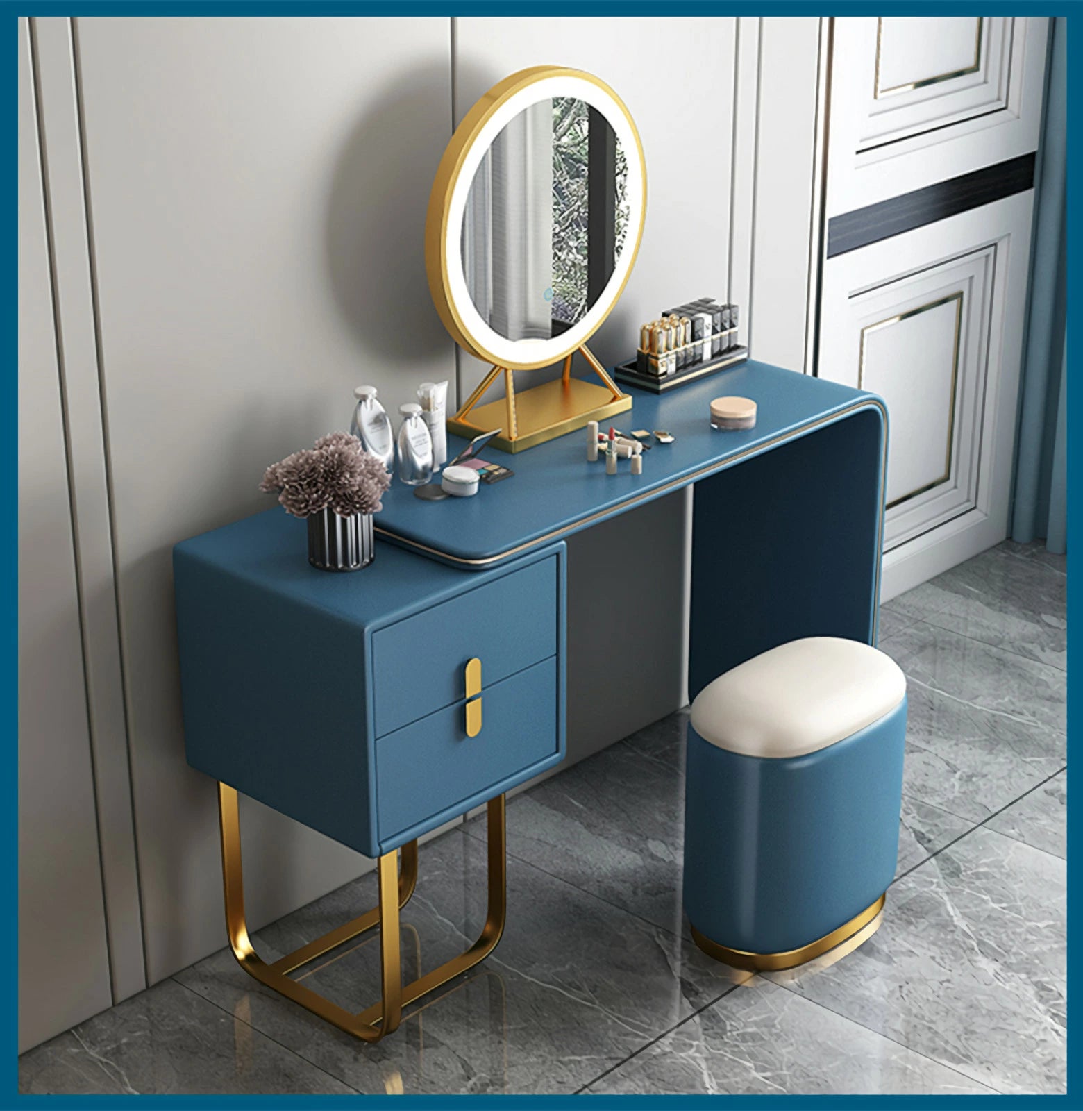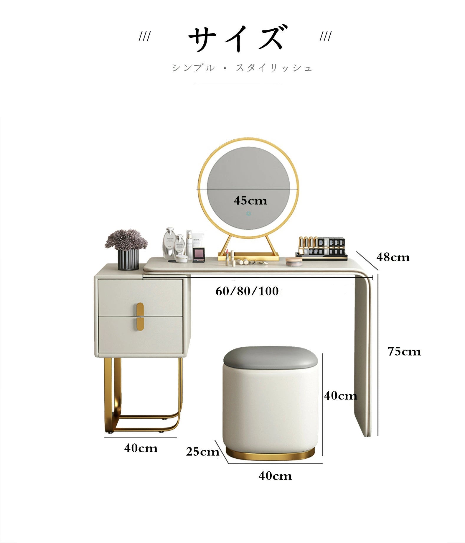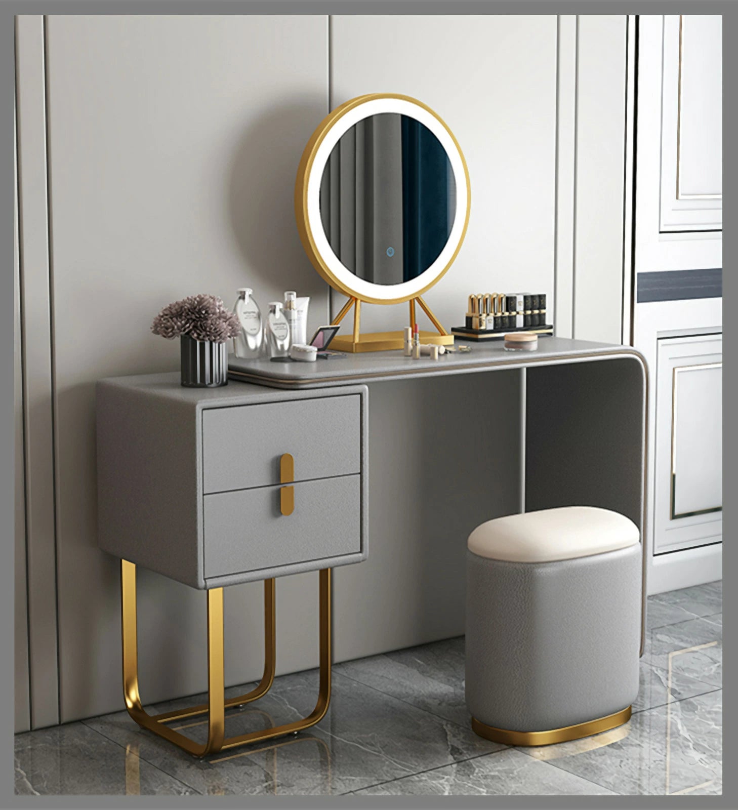 ドレッサー おしゃれ イタリア風 鏡台 レザー調 カラ 化粧台  ドレッサー LEDミラー スツール 化粧テーブル オシャレ エレガント セット J202